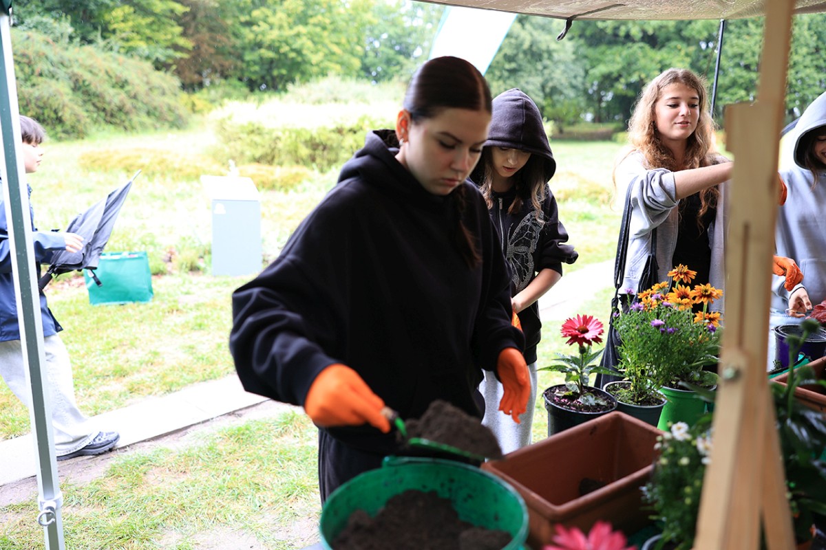 Największą atrakcją okazało się jednak wspólne sadzenie kwiatów na specjalnie przygotowanej rabacie. Jej projekt powstał dzięki dr hab. Agnieszki Jaszczak z UWM, a my zadbaliśmy o to, by ziemia była gotowa na przyjęcie pięknych, wyrośniętych sadzonek kocimiętki, jeżówki czy ostróżki. Każdy (oczywiście z naszą pomocą) mógł posadzić swoją roślinę, podpisać tabliczkę i uwiecznić ten moment na zdjęciu. Owady doceniły nasz trud, jeszcze zanim ostatnia sadzonka trafiła do ziemi, chętnie oblatywały nowe kwiaty.