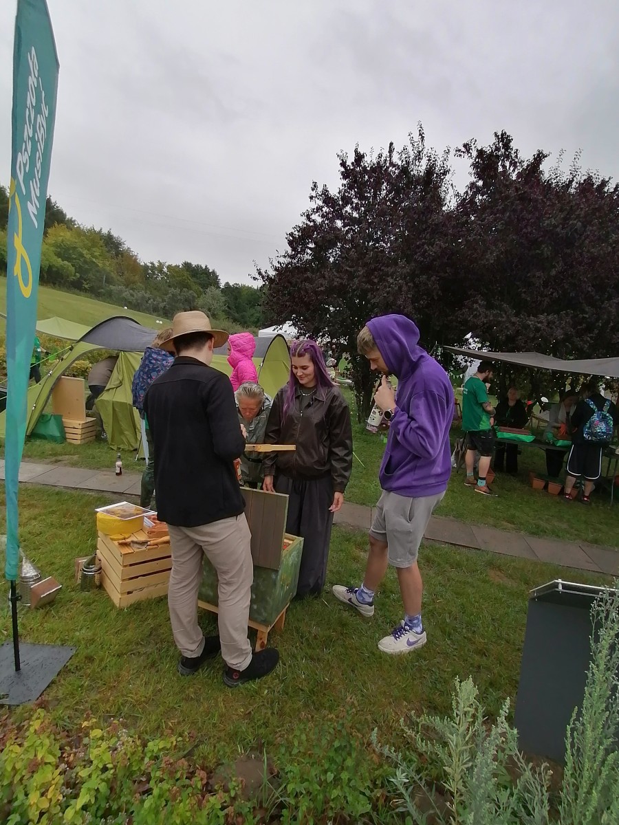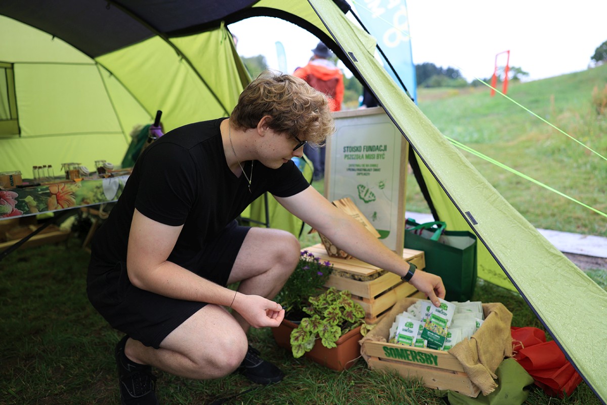 Podobnie jak w zeszłym roku, tak i teraz nie mogło zabraknąć naszego stoiska edukacyjnego. To tu, w otoczeniu zapachu wosku pszczelego i delikatnej woni kwiatów, toczyły się najciekawsze rozmowy. Pokazywaliśmy fascynujące eksponaty pszczelarskie – precyzyjnej budowy plastry miodu, różnokolorowe kulki pyłku pod mikroskopem, wyposażenie pracowni pasiecznej. Każdy mógł też przymierzyć strój pszczelarski, by poczuć się jak prawdziwy owadzi opiekun, a także spróbować pysznego miodu z pasieki Fundacji. Chcieliśmy, by wiedza o zapylaczach nie była suchą teorią z książek, ale żywym, fascynującym doświadczeniem, które zapada w pamięć i inspiruje do działania na co dzień. Dlatego też w naszych pogadankach nie mogło zabraknąć dzikich zapylaczy, które zwykle pozostają na uboczu naszej percepcji i komunikacji pomocowej. A to przecież właśnie z podzięki za ich trud i wkład w bioróżnorodność założyliśmy Fundację. Cieszymy się, że możemy szerzyć o nich wiedzę, co nie udałoby się bez pomocy marek świadomych odpowiedzialności społecznej biznesu, jak Somersby.